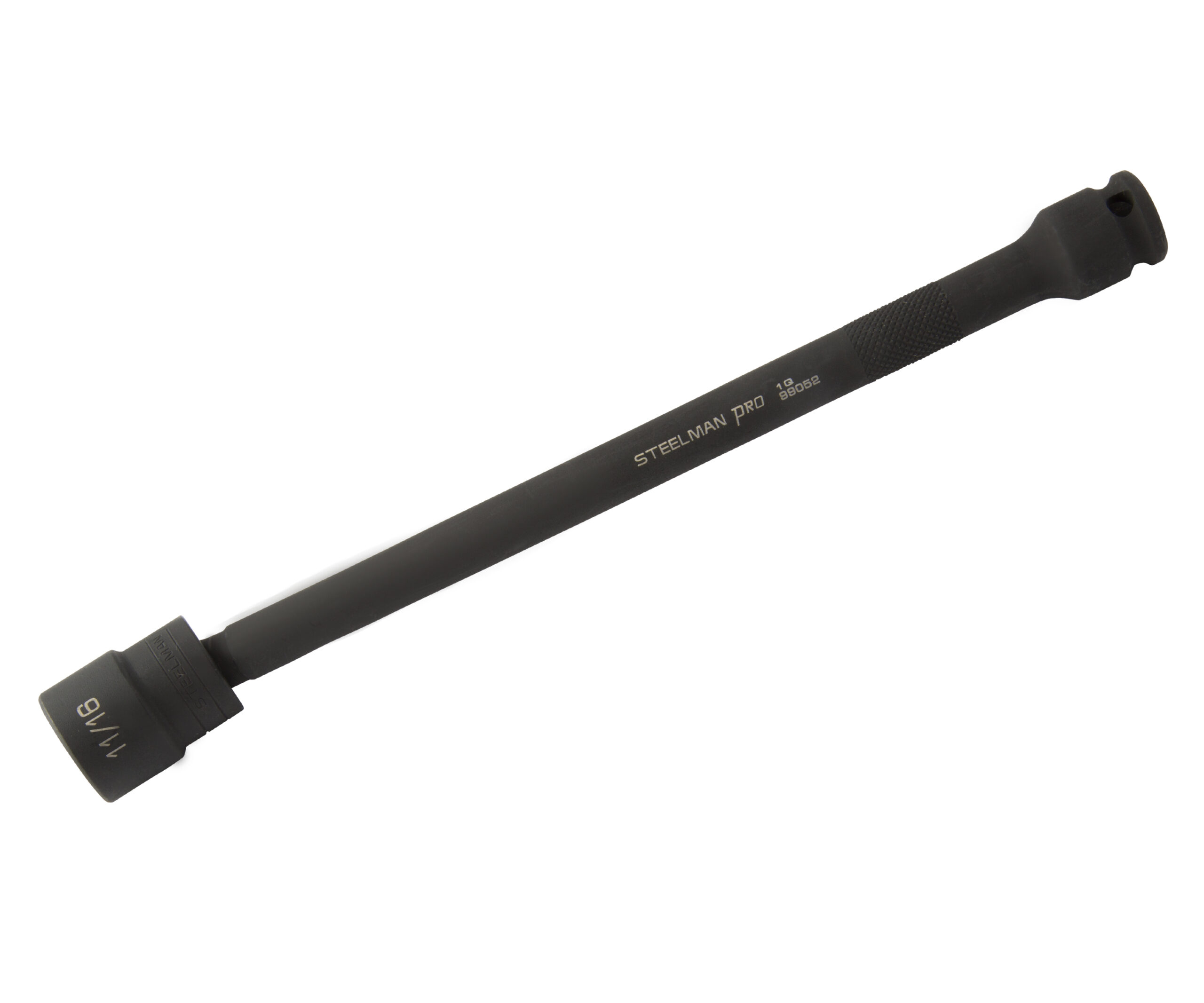The STEELMAN PRO 99052 11/16-Inch Swivel Head 3/8-Inch Drive, 9-Inch Impact Extension Socket was designed to get into hard-to-reach spaces where maximum power is needed. This SAE extension socket is made of high strength, heat treated 4140 chromoly steel with a black oxide finish. The knurled shaft allows for easy hand-starting and tightening of fasteners to prevent cross-threading. The pinless joint design transfers more useable torque to fasteners than a universal joint design, and also provides safety from flying projectiles that such designs can create upon failure. The socket head can pivot up to 30 degrees, providing a high degree of flexibility and allowing for a wide range of applications.
