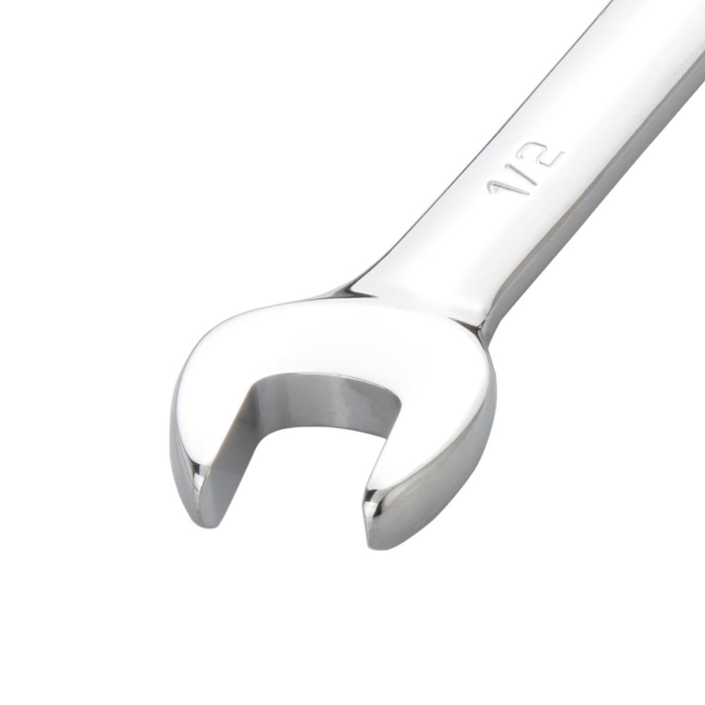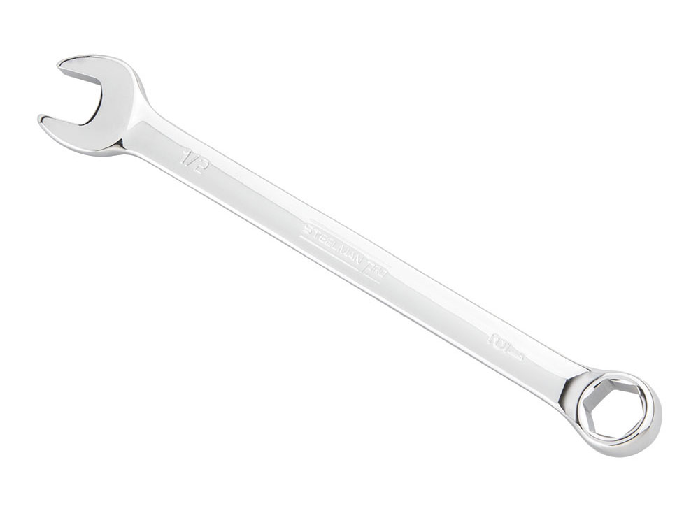 Work with the same quality tools as service technicians with the STEELMAN PRO 78535 12-Piece SAE 6-Point Combination Wrench Set. Constructed of heat treated chrome vanadium steel alloy these tools are guaranteed to meet or exceed ASME and ANSI torque standards to give you the long lasting durability you require from your tools. Size callouts are stamped into the steel both vertically and horizontally on both sides of each wrench to make identification easy. A mirror-polish chrome plating covers each wrench providing rust and corrosion resistance that is easily wiped clean when soiled. Open ends on these combo wrenches are angled 15-degrees to provide increased leverage and easier access to fasteners in tight places. Similarly, the box end has a 15-degree offset to provide your fingers with that little bit of extra clearance that they need as you work while the 6-point box grips fasteners on the sides to prevent rounding. Set includes the following standard sizes: 1/4, 5/16, 3/8, 7/16, 1/2, 9/16, 11/16, 3/4, 13/16, 7/8, 15/16, and 1-inch. When the job is done the wrenches can be stored in the included ABS plastic storage rack that can either lay flat inside a toolbox drawer or be hung on a wall using the folding carrying handle.