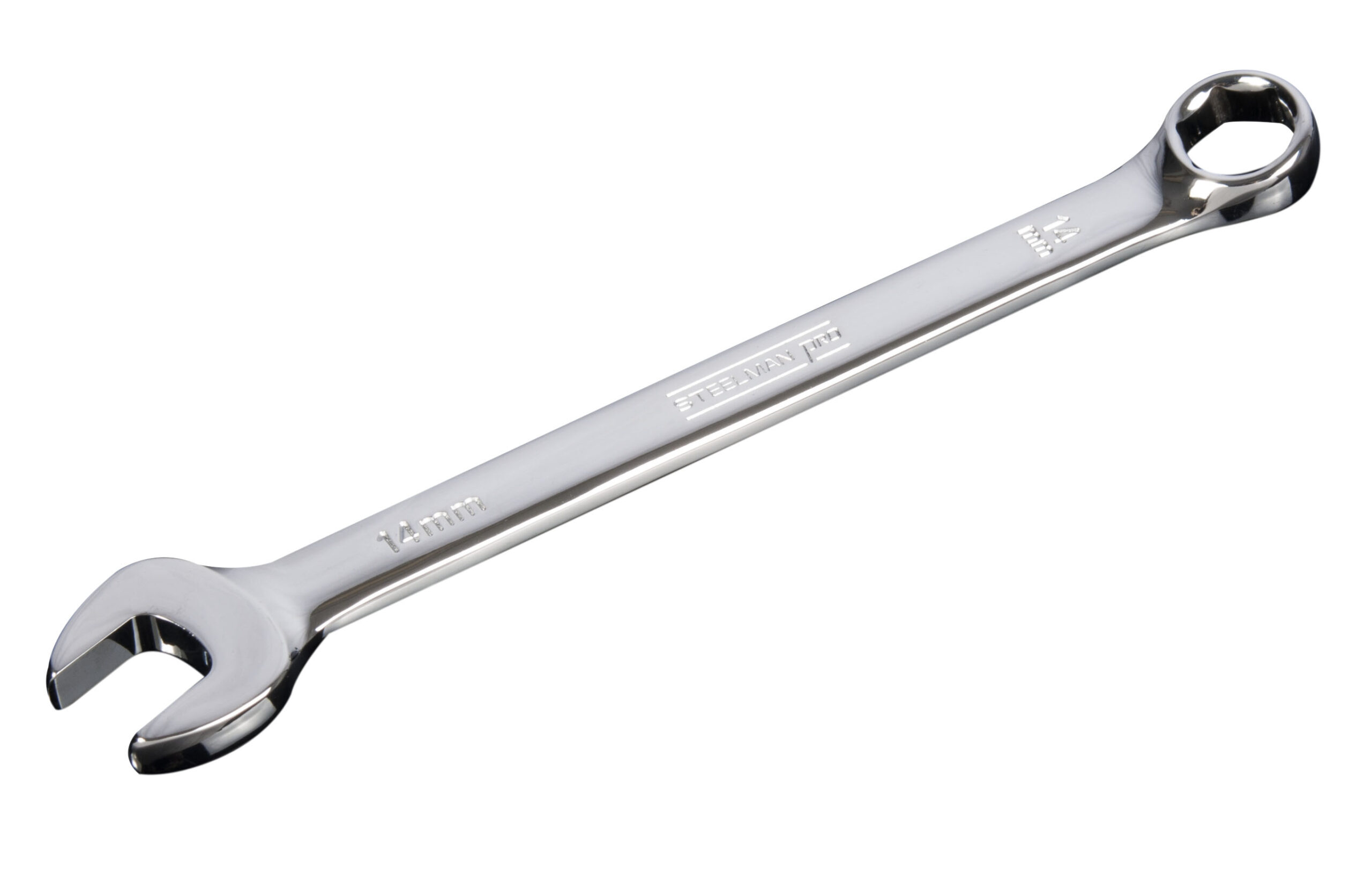 Work with the same quality tools as service technicians with the STEELMAN PRO 78339 14mm Combination Wrench with 6-Point Box End. Constructed of heat treated chrome vanadium steel alloy this tool is guaranteed to meet or exceed ASME and ANSI torque standards to give you the long lasting durability you require from your tools. Size callouts are stamped into the steel both vertically and horizontally on both sides of the wrench to make identification easy. A mirror-polish chrome plating covering provides rust and corrosion resistance and is easy to wipe clean when soiled with oil and other workshop grime. The open end on this combo wrench is angled 15-degrees to provide increased leverage and easier access to fasteners in tight places. Similarly, the box end has a 15-degree offset to provide your fingers with that little bit of extra clearance that they need as you work. The 6-point box design grips the sides of fasteners and not the corners to provide maximum torque transfer with a reduced chance of rounding off fasteners.