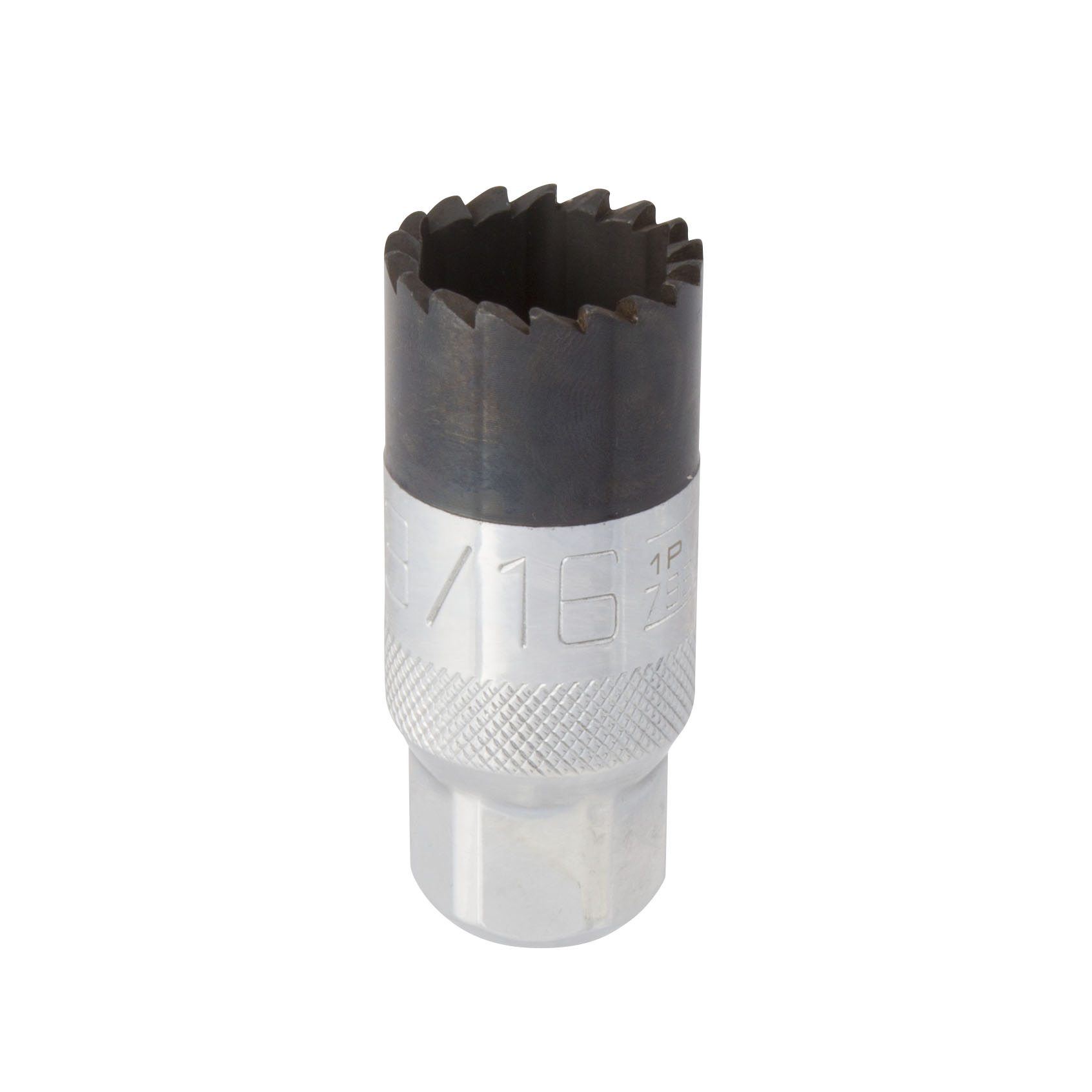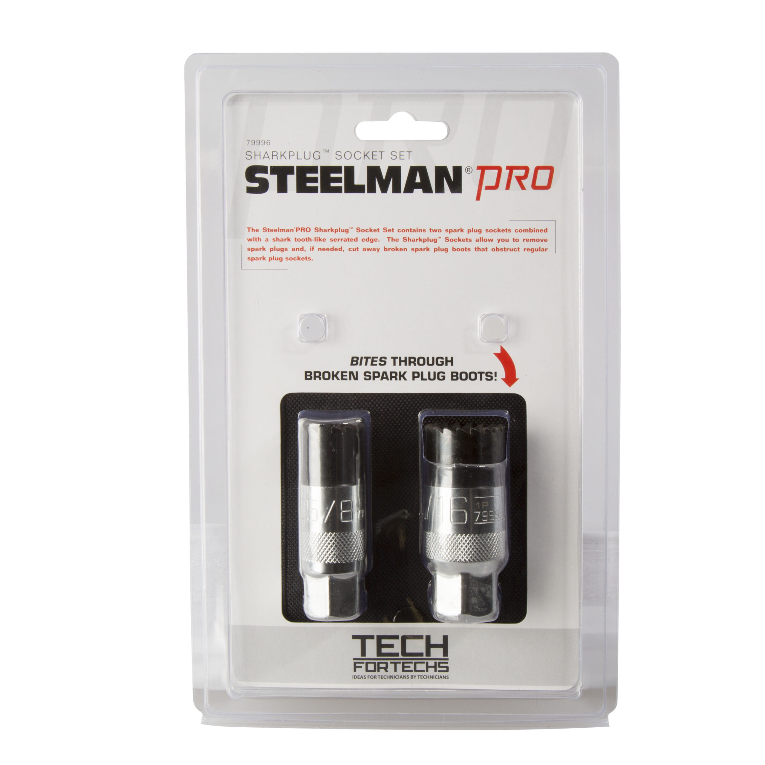Whether you?re tuning up that car that’s been using the same spark plugs since the first day or repairing that broken-down lawnmower, the STEELMAN PRO 79996 2-Piece 3/8-Inch Drive 5/8-Inch and 13/16-Inch Sawtooth Spark Plug Socket Set will help you get the job done in less time. Constructed of durable chrome-vanadium steel, the sockets in this set feature an innovative serrated cutting edge that enables them to cut through broken spark plug boots. This allows you to remove 5/8-inch and 13/16-inch sized spark plugs without having obstructions slowing you down. Rust and corrosion-resistant black oxide coating on the cutting surface help prolong the tool’s life and make sure they are always ready for the next job. The hex-shaped ends allow them to be used with combination wrenches and other hand tools when additional torque is needed to remove a stubborn or rusted-in plug. Hard stamped size markings in the steel help with easy identification and a snap-secured 2-pocket fabric storage pouch provide convenient storage between uses.