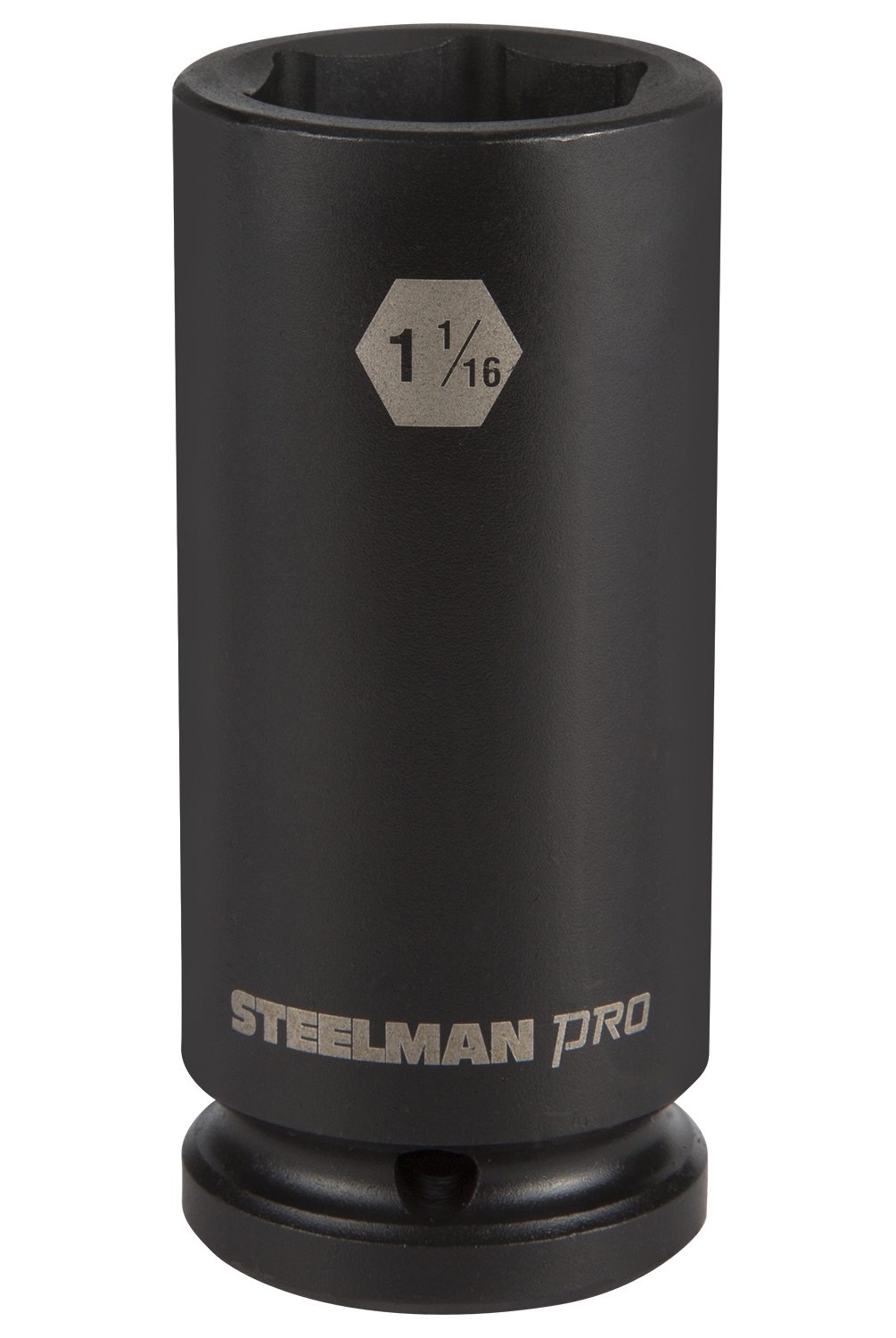 Every mechanic knows that having a reliable set of tools can make your life easier when working on heavy-duty vehicles and equipment. The STEELMAN PRO 79266 3/4-Inch Drive 6-Point Deep Impact 1-1/16-Inch Socket is ideal for use in performing maintenance, repairs and service on large trucks and tractor trailers, farming equipment and tractors, oilfield and construction equipment, and mass transit vehicles. Made from drop forged and heat treated chromoly steel, this socket features a ball detent recess on the 3/4-inch drive end to help hold it securely onto ratchets, air wrenches, adapters, and extensions. The 6-point shape grips the sides of fasteners and not the corners, reducing wear and the chance of rounding the fastener and the deep well design allows easy reach of nuts on extended threads and recessed bolts. The socket features a rust and corrosion resistant black phosphate protective coating with laser etched size callouts and markings. Rated to withstand up to 150% of ASME torque requirements for impact tools, this socket can handle tough use in any professional shop / garage, home workshop, or on the work site.