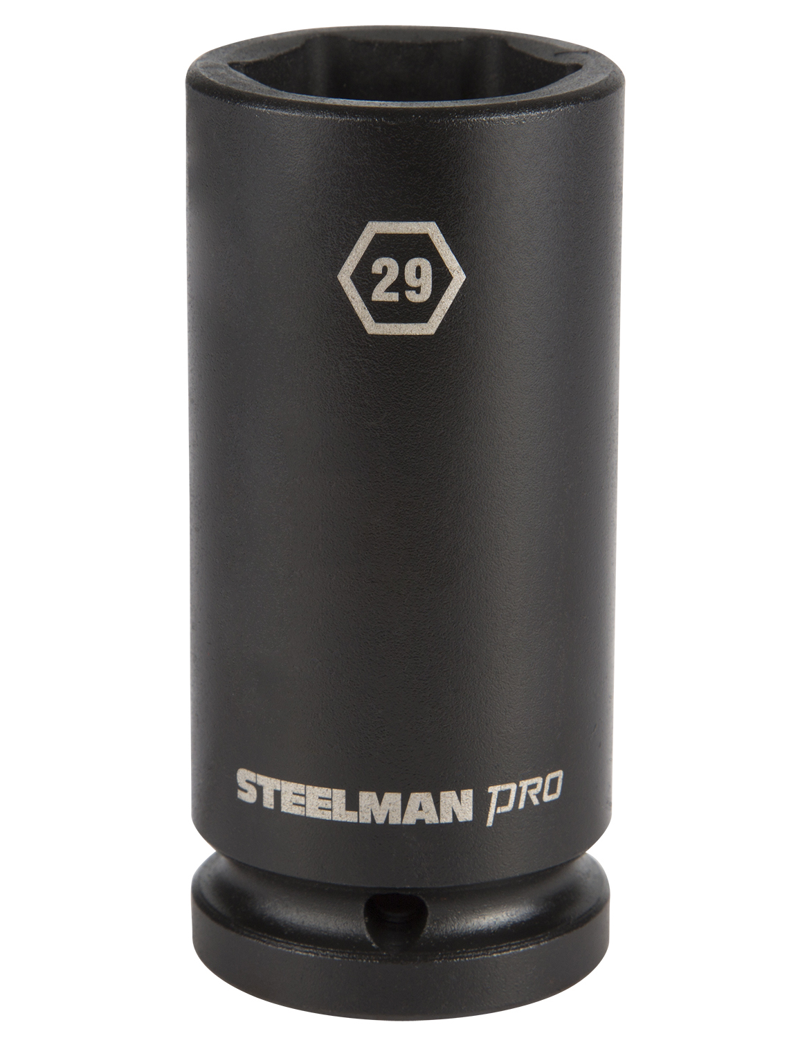 Every mechanic knows that having a reliable set of tools can make your life easier when working on heavy-duty vehicles and equipment. The STEELMAN PRO 79282 3/4-Inch Drive 6-Point 29mm Deep Impact Socket is ideal for use in performing maintenance, repairs and service on large trucks and tractor trailers, farming equipment and tractors, oilfield and construction equipment, and mass transit vehicles. Made from drop forged and heat treated chromoly steel, this socket features a ball detent recess on the 3/4-inch drive end to help hold it securely onto ratchets, air wrenches, adapters, and extensions. The 6-point shape grips the sides of fasteners and not the corners, reducing wear and the chance of rounding the fastener and the deep well design allows easy reach of nuts on extended threads and recessed bolts. The socket features a rust and corrosion resistant black phosphate protective coating with laser etched size callouts and markings. Rated to withstand up to 150% of ASME torque requirements for impact tools, this socket can handle tough use in any professional shop / garage, home workshop, or on the work site.