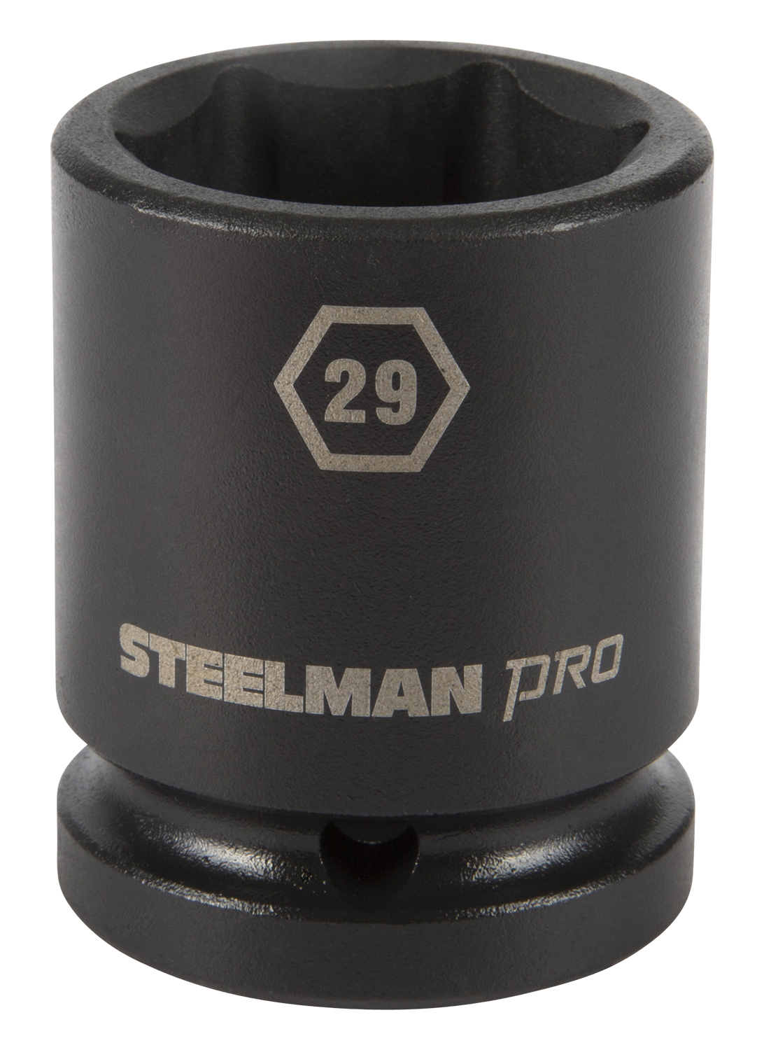 Every mechanic knows that having a reliable set of tools can make your life easier when working on heavy-duty vehicles and equipment. The STEELMAN PRO 79275 3/4-Inch Drive 6-Point 29mm Impact Socket is ideal for use in performing maintenance, repairs and service on large trucks and tractor trailers, farming equipment and tractors, oilfield and construction equipment, and mass transit vehicles. Made from drop forged and heat treated chromoly steel, these sockets feature a ball detent recess on the 3/4-inch drive end to help hold it securely onto ratchets, air wrenches, adapters, and extensions. The 6-point design grips the sides of fasteners and not the corners, reducing wear and the chance of rounding the fastener. The socket features a rust and corrosion resistant black phosphate protective coating with laser etched size callouts and markings. Rated to withstand up to 150% of ASME torque requirements for impact tools, this socket can handle tough use in any professional shop / garage, home workshop, or on the work site.