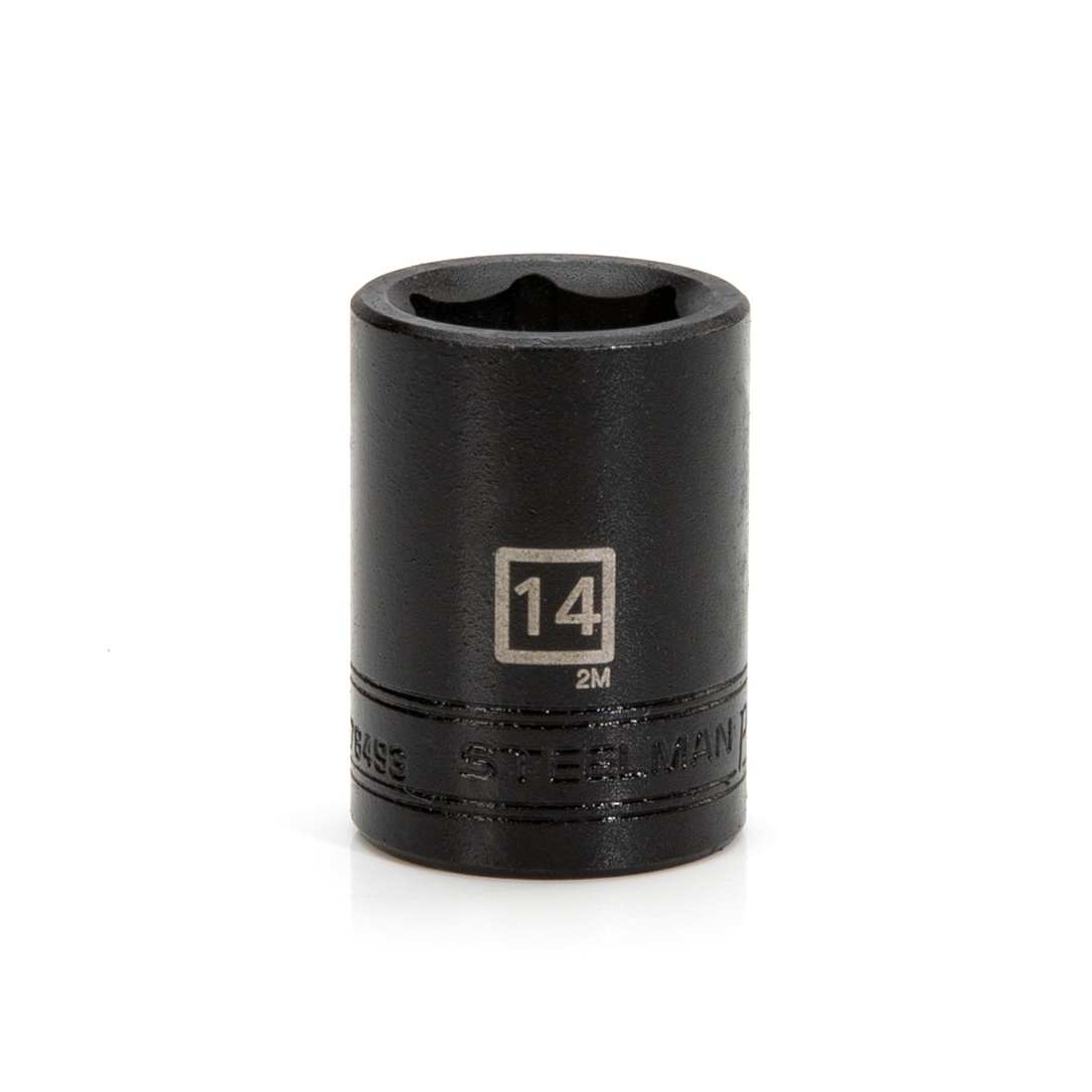 Having reliable and dependable tools can make any mechanic’s or maintenance engineer’s life easier, so be sure to find a home in your tool box for the STEELMAN PRO 78493 3/8-Inch Drive x 14mm 6-Point Impact Metric Socket. Constructed of durable and heavy-duty chrome vanadium steel, this socket has the strength required for high torque jobs and will fit onto any 3/8-inch drive electric or pneumatic impact wrench, ratchet, torque wrench, extension bar, or adapter. This shallow depth socket features a rust and corrosion resistant black oxide protective finish. The socket’s 6-point design grips the sides of fasteners and not the corners, reducing wear and the chance of slippage or rounding the fastener. Easy to read size markings are laser etched onto the steel making it simple to identify the socket without the worry that the markings will wear away or rub off with use. Rated to meet or exceed ANSI / ASME performance requirements for hand tools, these can handle tough use in any professional or home shop / garage.