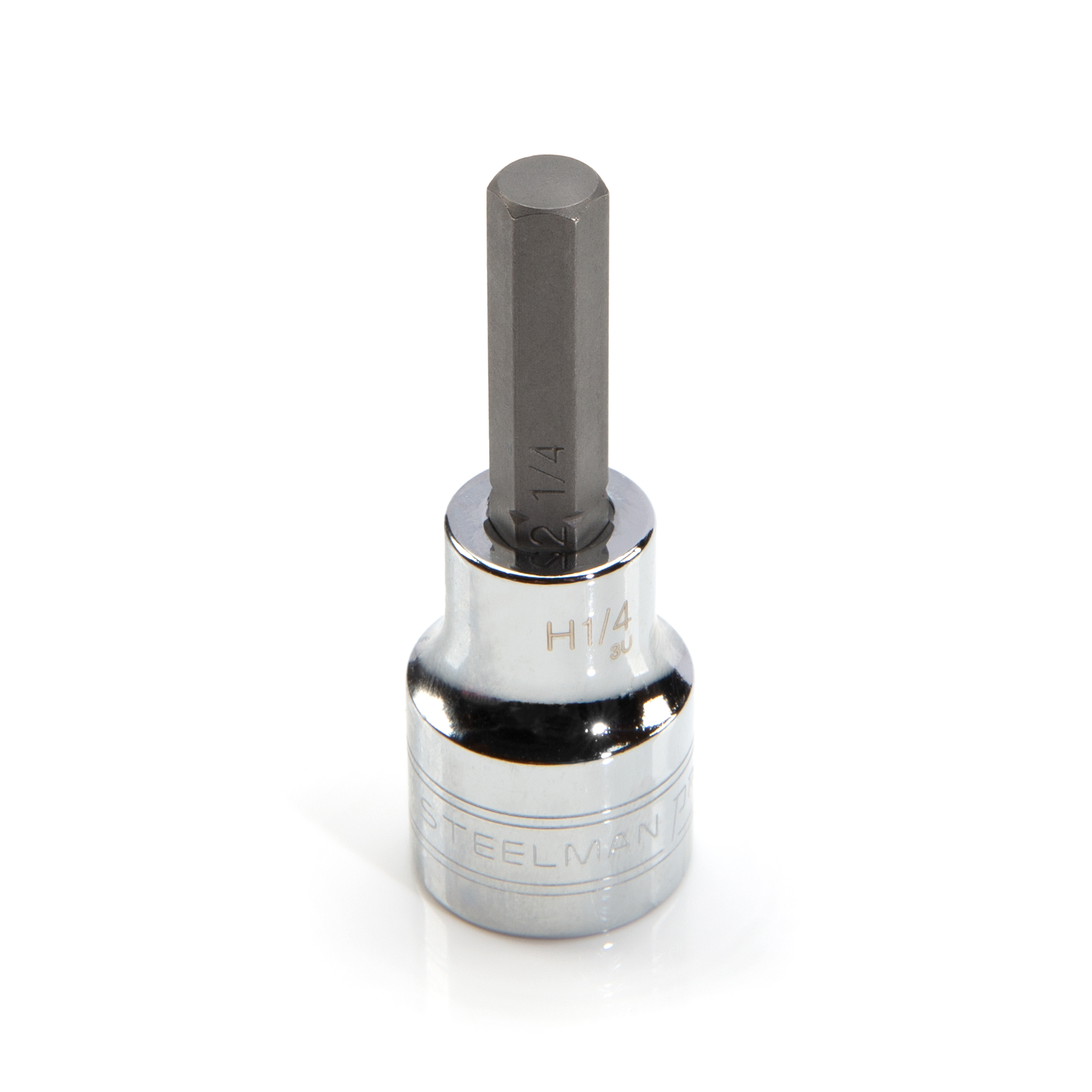 Whether you’re tightening brake calipers or assembling furniture, tackle the task like a pro with the STEELMAN PRO 78378 3/8-Inch Drive x 1/4-Inch Hex Bit Socket delivers the dependable grip you need. With a hex bit machined from high-strength S2 steel to prevent twisting and deformation under high loads set into a durable chrome vanadium steel socket, this tools is designed for long-term service in the busiest repair shops. For quick identification, the socket has easy to read size markings permanently laser etched into the steel that won’t wear or fade away. A ball detent recess on the drive end keeps the socket securely attached to ratchets, extension bars, and adapters. To ensure maximum torque transfer, the drive end also has corner recesses that transmit applied force to the flats instead of focusing on the corners which can lead to slippage, rounding, and premature tool failure. Designed and constructed to meet or exceed ASME tool performance standards, this tools can stand up to the rigors of any professional workshop while being just as handy in the home mechanic’s garage.
