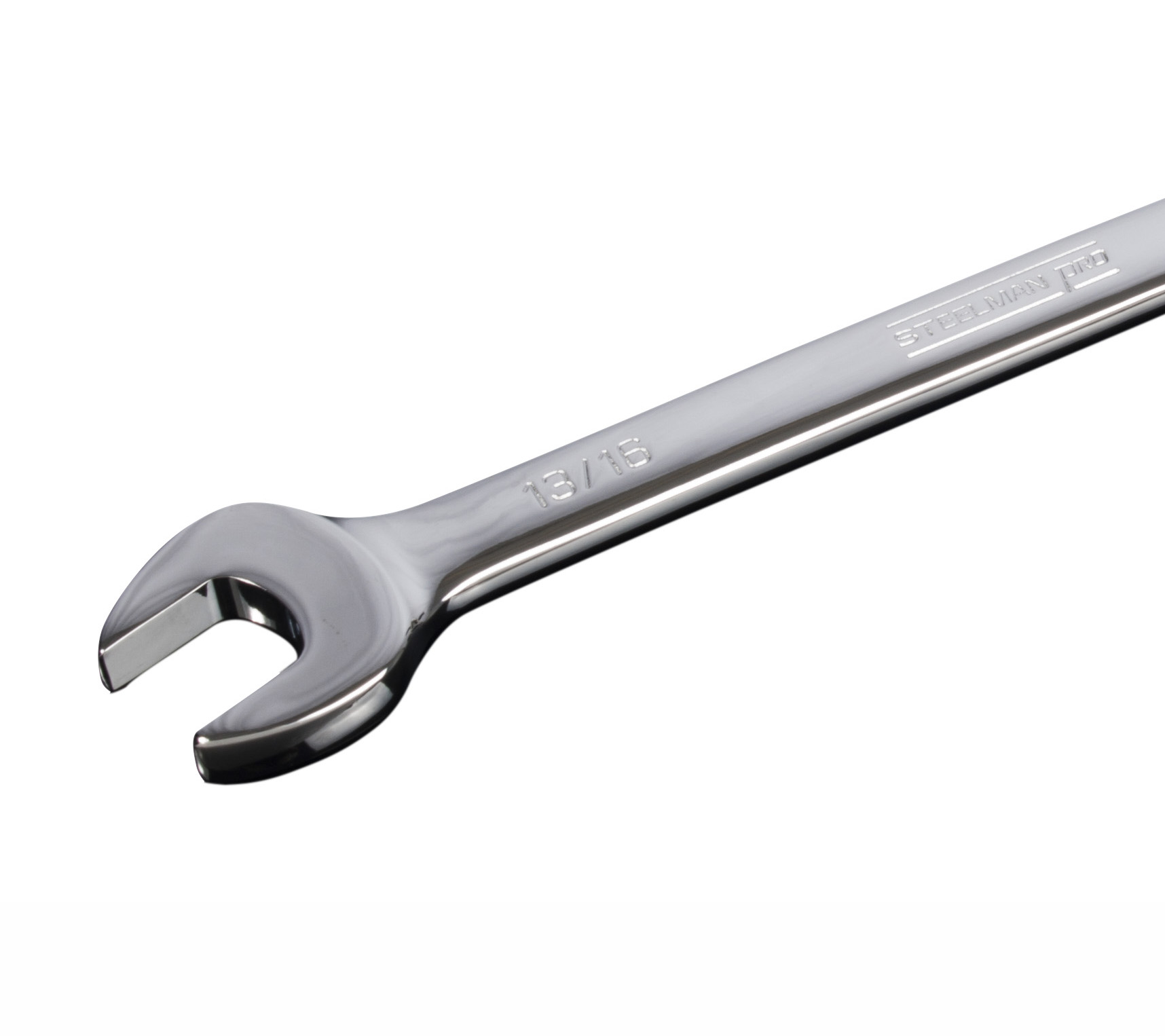 Work with the same quality tools as service technicians with the STEELMAN PRO 78358 13/16-Inch Full Polish SAE Combination Wrench with 6-Point Box End. Constructed of heat treated chrome vanadium steel alloy this tool is guaranteed to meet or exceed ASME and ANSI torque standards to give you the long lasting durability you require from your tools. Size callouts are stamped into the steel both vertically and horizontally on both sides of the wrench to make identification easy. A mirror-polish chrome plating covering provides rust and corrosion resistance and is easy to wipe clean when soiled with oil and other workshop grime. The open end on this combo wrench is angled 15-degrees to provide increased leverage and easier access to fasteners in tight places. Similarly, the box end has a 15-degree offset to provide your fingers with that little bit of extra clearance that they need as you work. The 6-point box design grips the sides of fasteners and not the corners to provide maximum torque transfer with a reduced chance of rounding off fasteners.