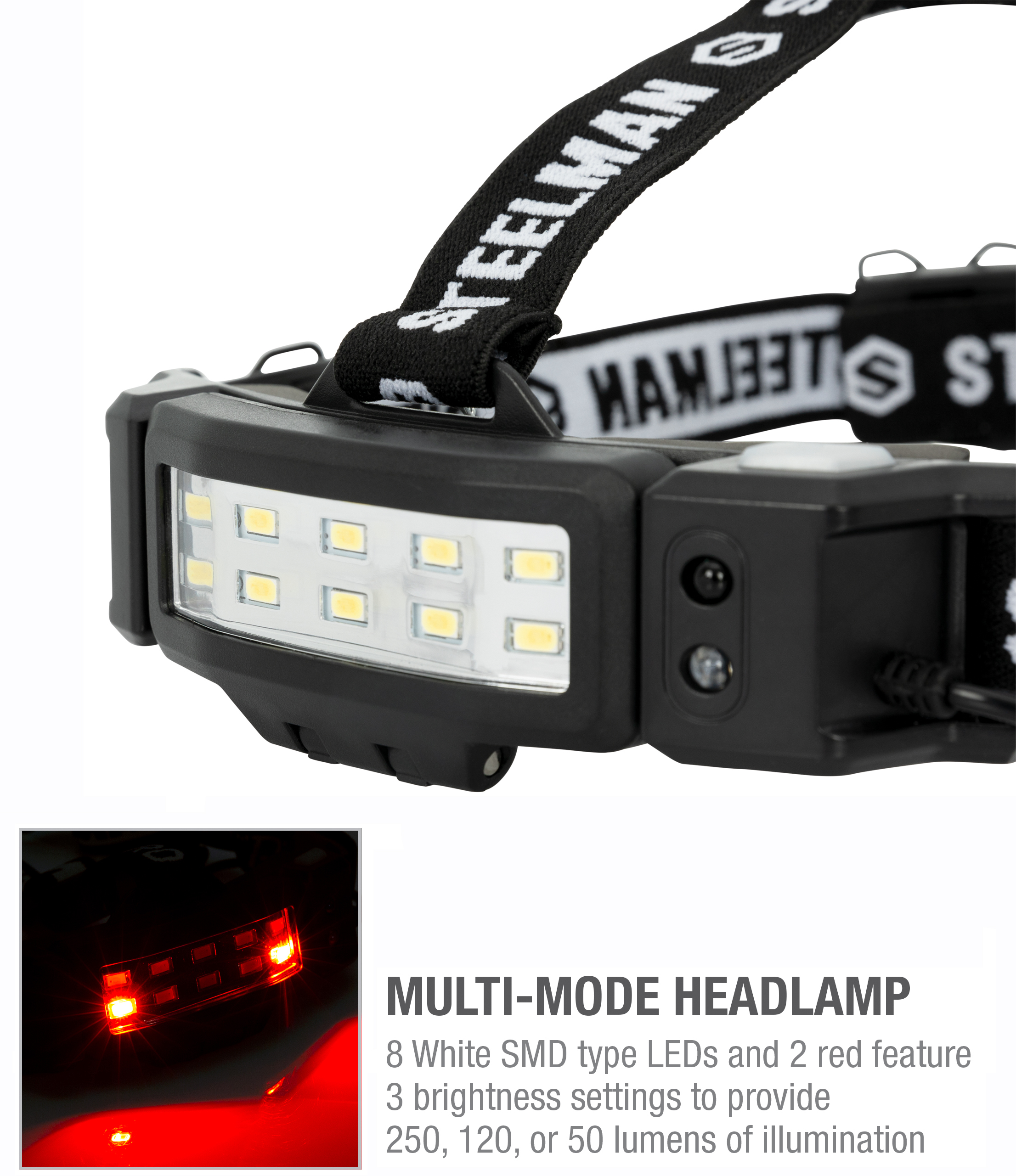 Thanks to the STEELMAN Slim Profile LED Headlamp with Red LED Mode, you’ll never be left in the dark. This versatile, easy-to-use head lamp features 8 powerful white SMD style LEDs with three intensity settings and a second set of 2 red LEDs for night vision use. The different light modes are controlled by either a conventional push button like a standard flashlight or hands-free thanks to a built-in motion sensor. The white LEDs are capable of providing a maximum 250 lumens of light out to a range of 20m for 3 hours on high setting, 120 lumens out to 15m for 4.5 hours, or a long lasting 60 lumens out to 10m for 9 hours. A rear safety LED is mounted on the battery case and is controlled by a separate switch to provide steady or flashing red light so you can be seen from behind as well as from ahead. The main LED headlamp is mounted on an adjustable bracket that provides 80 degrees of articulation so you can aim the light where you need it without having to awkwardly crane your neck. The headband is fully adjustable and ideal for use while hiking, backpacking, and camping, even in inclement weather thanks to its IP65 rated ABS case that keeps out dust and rain. It is also great for inspections and hard hat zones thanks to the included patent-pending clip system that can secure the lamp to any hard hat. The light is powered by three AA batteries, which come included for your convenience.