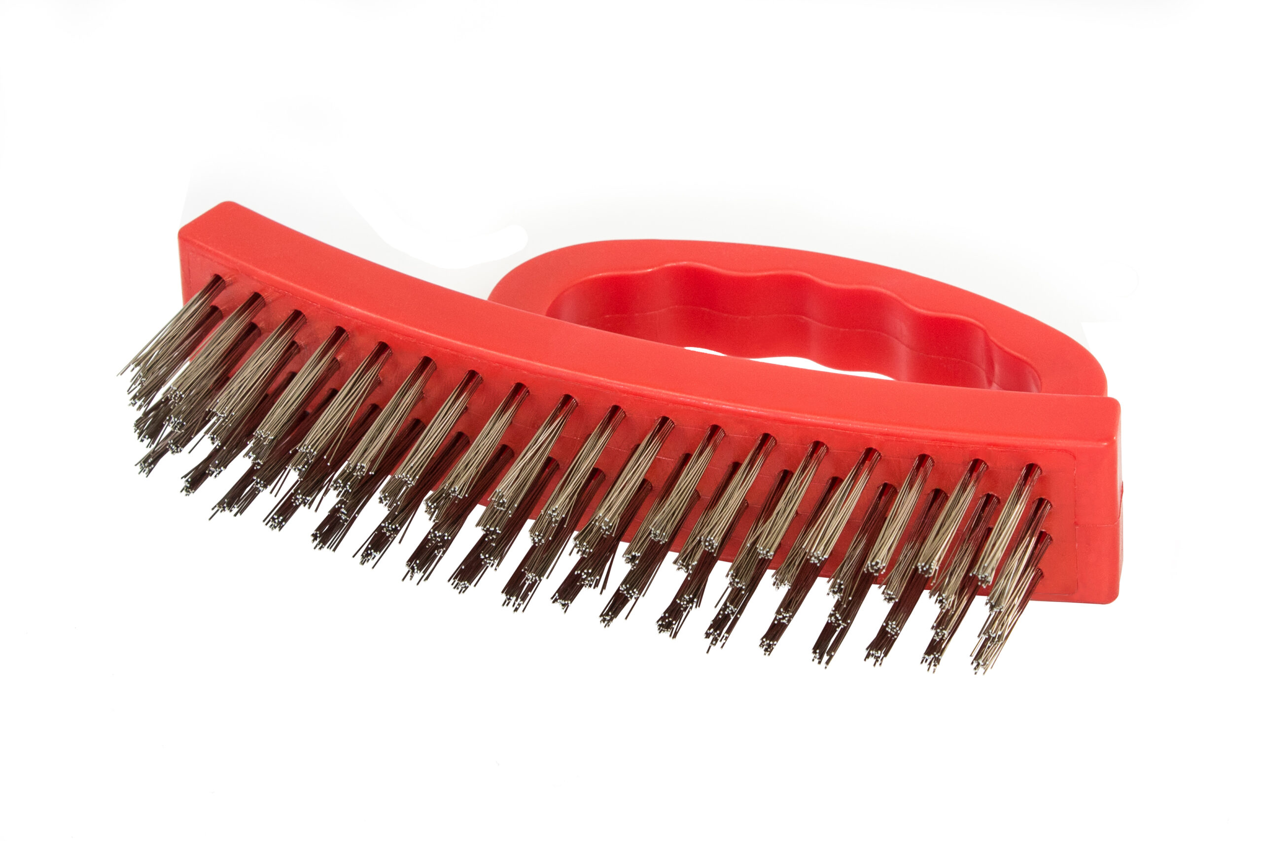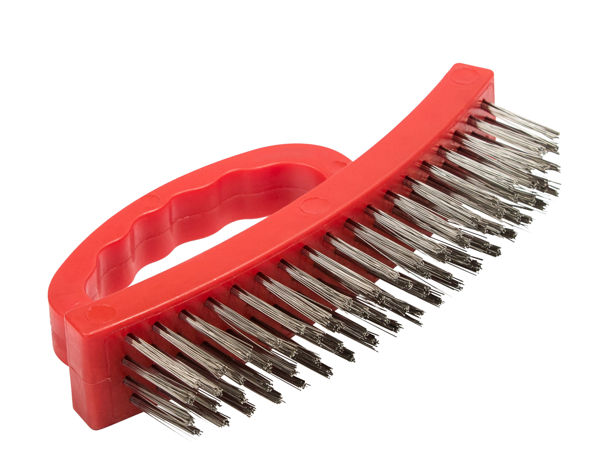 The Steelman 98797 6.5-Inch Nylon Body Wire Brush with Stainless Steel Bristles is an essential tool in any automotive or metal fabrication shop. This sturdy brush can be used for a wide range of applications, including weld cleaning, cutting and drilling deburring, rust and oxide removal, paint removal, and surface preparation and finishing. It features bristles arranged in 4 rows of 18 for 72 total bundles of flexible stainless steel bristles that easily remove contaminants from base materials without rusting or discoloring those surfaces. The curved base and sure-grip handle provide better leverage when trying to remove stubborn debris. Constructed of durable nylon composite plastic, this brush is ideal for industrial settings as well as at-home use.