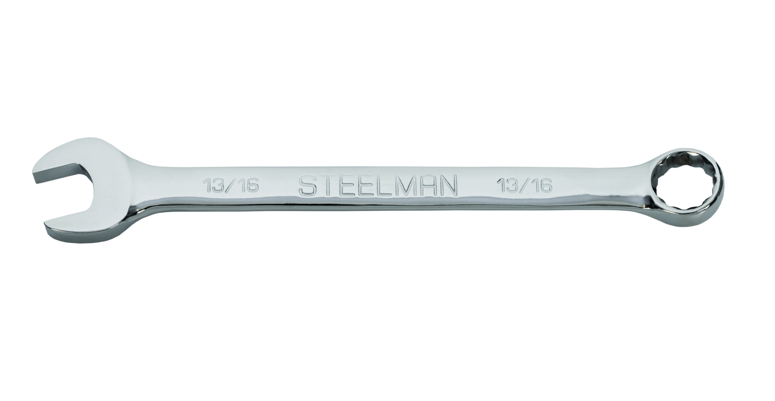 Work with the same quality tools as professional mechanics and service technicians with a STEELMAN 82556 13/16-Inch SAE Combination Wrench with 12-Point Box End. This durable alloy steel tool is designed to allow you to remove and tighten multiple kinds of fasteners without needing additional tools. The 12-point box end can be used to work on 12-point, traditional 6-point, and even 4-point nuts, bolts, and other fasteners. The tool’s angled open end makes it easier to use on fasteners in small spaces that restrict access by letting you flip the wrench around and access the fastener from a new angle. The offset box end provides extra clearance to get past obstructions as well as make room for your hands and knuckles as you work. Multiple size markings on the wrench are hard stamped directly into the steel on both sides for easy identification doesn’t wear away or rub off with repeated tool use. The easy to clean, full polished chrome finish protects against rust and corrosion to further prolong tool life.