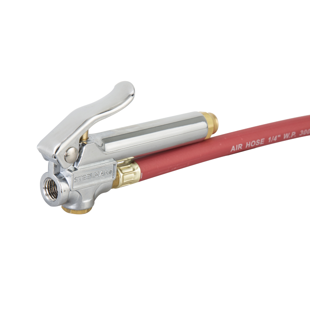 The STEELMAN 75051 Straight Chuck Tire Inflator with Built-In Gauge and 12-Inch Hose is a durable, compact addition to your air compressor’s accessory kit. Its tapered design is easy to use and the push on inflator tip works with several valve types used on both cars and trucks. With a polished steel main casing and brass fittings that can easily hold up to long use. The 12-inch long, 1/4-inch diameter hose allows you to easily reach hidden valves as well as reach around corners. The built-in gauge can measure tire air pressures in a range of 10 to 90 PSI. Useable with any portable or fixed tank air compressor and the casing is threaded to accept standard 1/4-inch NPT fittings.