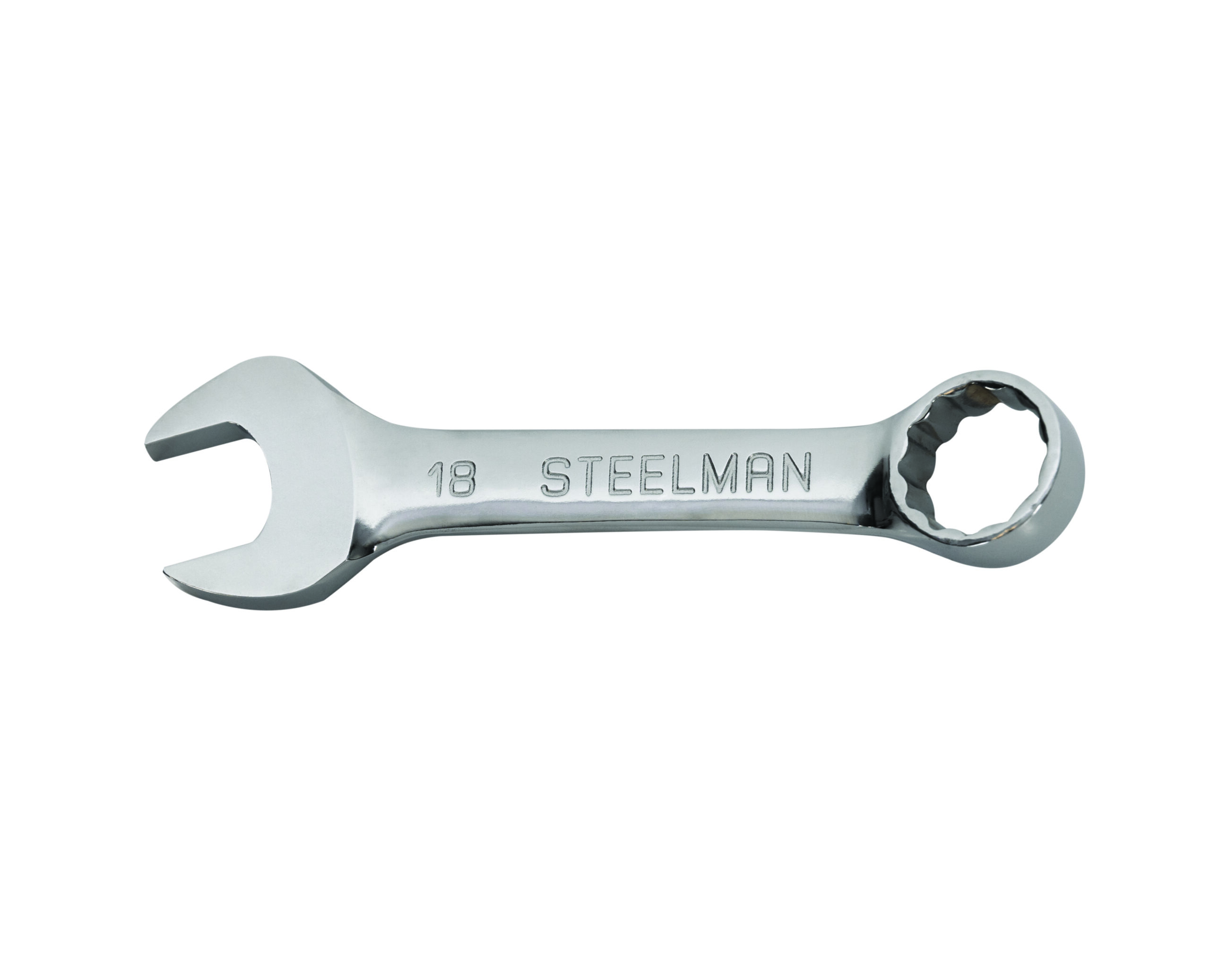 Work with the same quality tools as professional mechanics and service technicians with a STEELMAN 82596 18mm Stubby Size 12-Point Metric Combination Wrench. This durable alloy steel tool is designed to allow you to remove and tighten multiple kinds of fasteners without needing additional tools. The 12-point box end can be used to work on 12-point, traditional 6-point, and even 4-point nuts, bolts, and other fasteners. The compact size of this stubby wrench allows it to be used in tight spaces that are too restrictive for full size tools to be used. The tool’s angled open end makes it easier to use on fasteners in small spaces that restrict access by letting you flip the wrench around and access the fastener from a new angle. The offset box end provides extra clearance to get past obstructions as well as make room for your hands and knuckles as you work. Multiple size markings on the wrench are hard stamped directly into the steel on both sides for easy identification doesn’t wear away or rub off with repeated tool use. The easy to clean, full polished chrome finish protects against rust and corrosion to further prolong tool life.