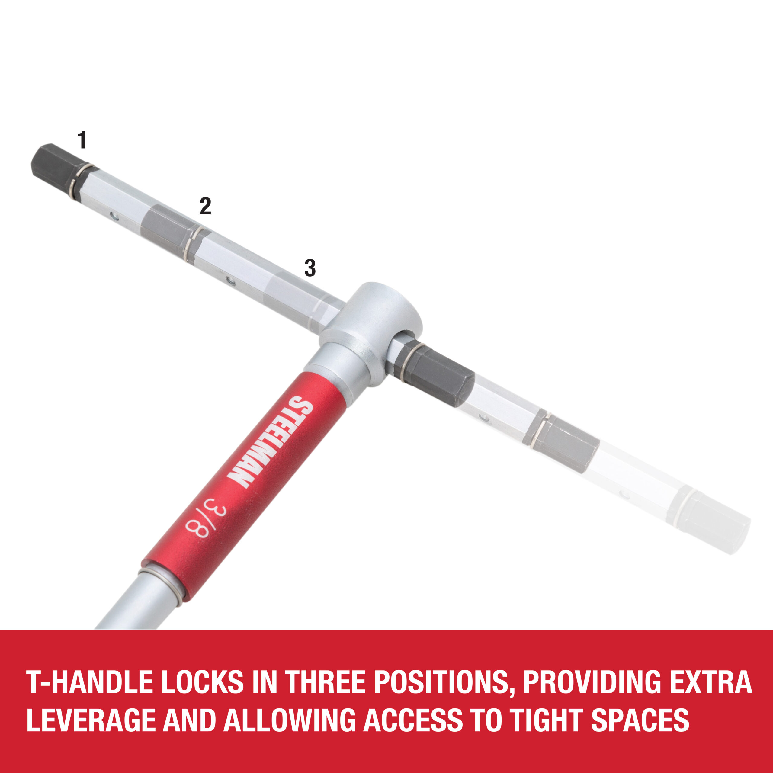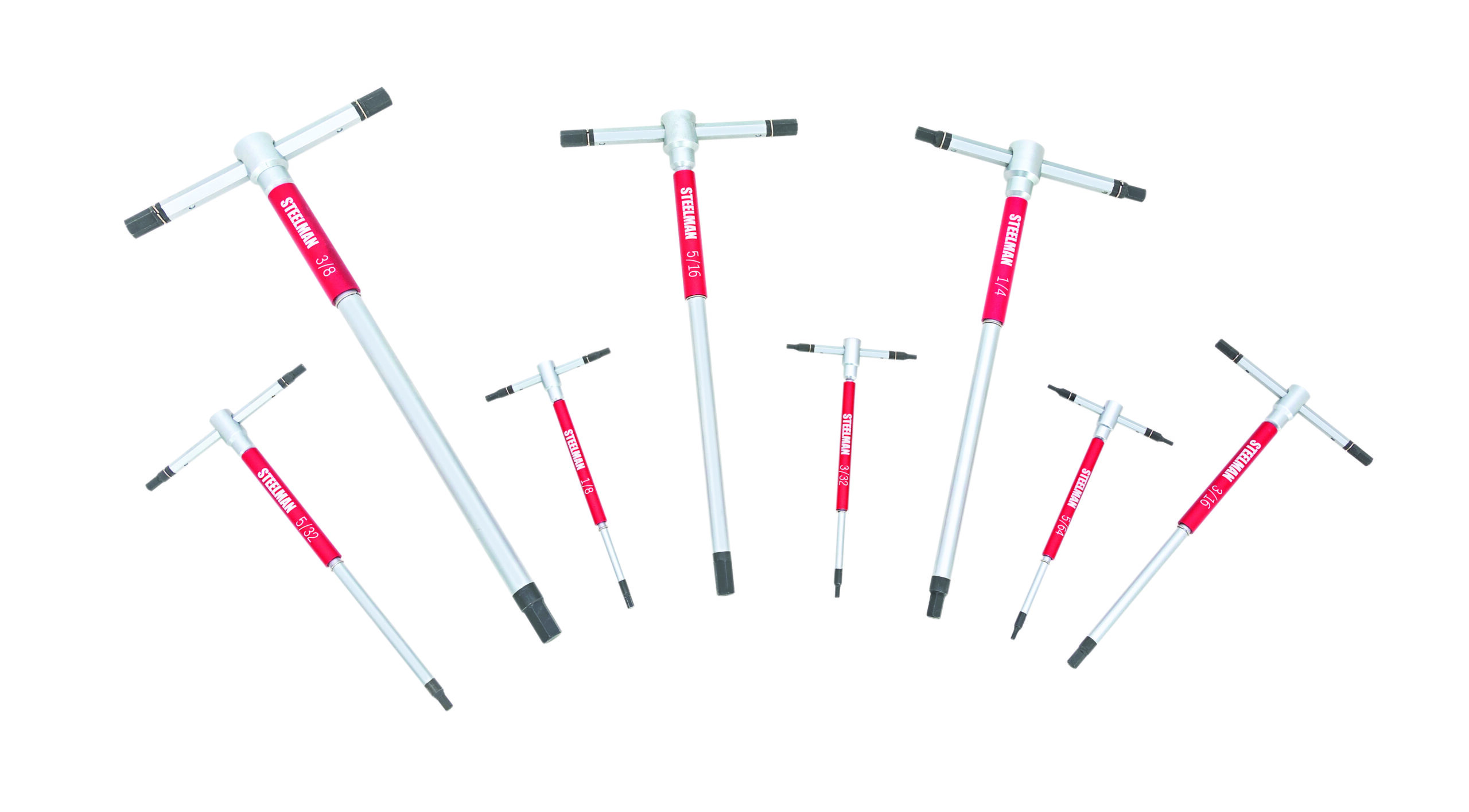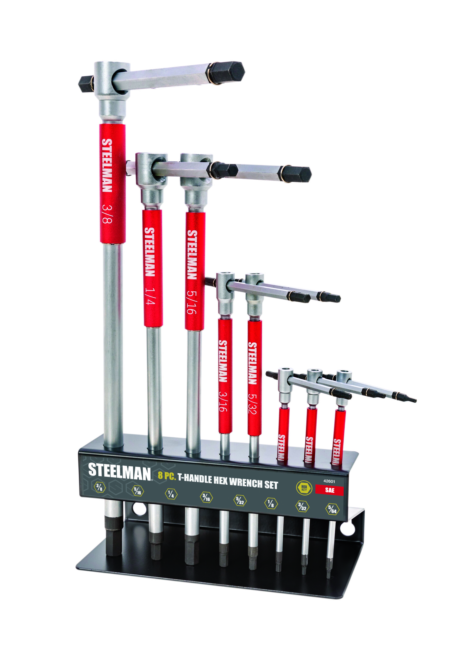 Take on SAE hex head fasteners with increased speed using the STEELMAN 42600 8-Piece Sliding T-Handle SAE Hex Key Set. These wrenches come equipped with a sliding T-handle end that lets you slide the handle to one side for increased leverage against stuck or sized fasteners and screws. When tightening or loosening fasteners, a free-spinning sleeve on the main tool shaft lets you quickly spin the tool without having to reposition your hand, letting you work with increased speed and efficiency. This set includes the following standard / SAE hex key sizes: 5/64-inch, 3/32-inch, 1/8-inch, 5/32-inch, 3/16-inch, 1/4-inch, 5/16-inch, and 3/8-inch. When not in use, the included storage rack helps keep your wrenches organized and easily visible for fast selection and access.